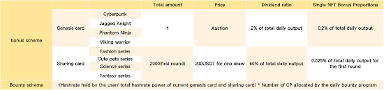 Genesis Card Bonus Scheme: 2% A total of 10 Genesis Cards, each Genesis Card can get 0.2% of the block revenue